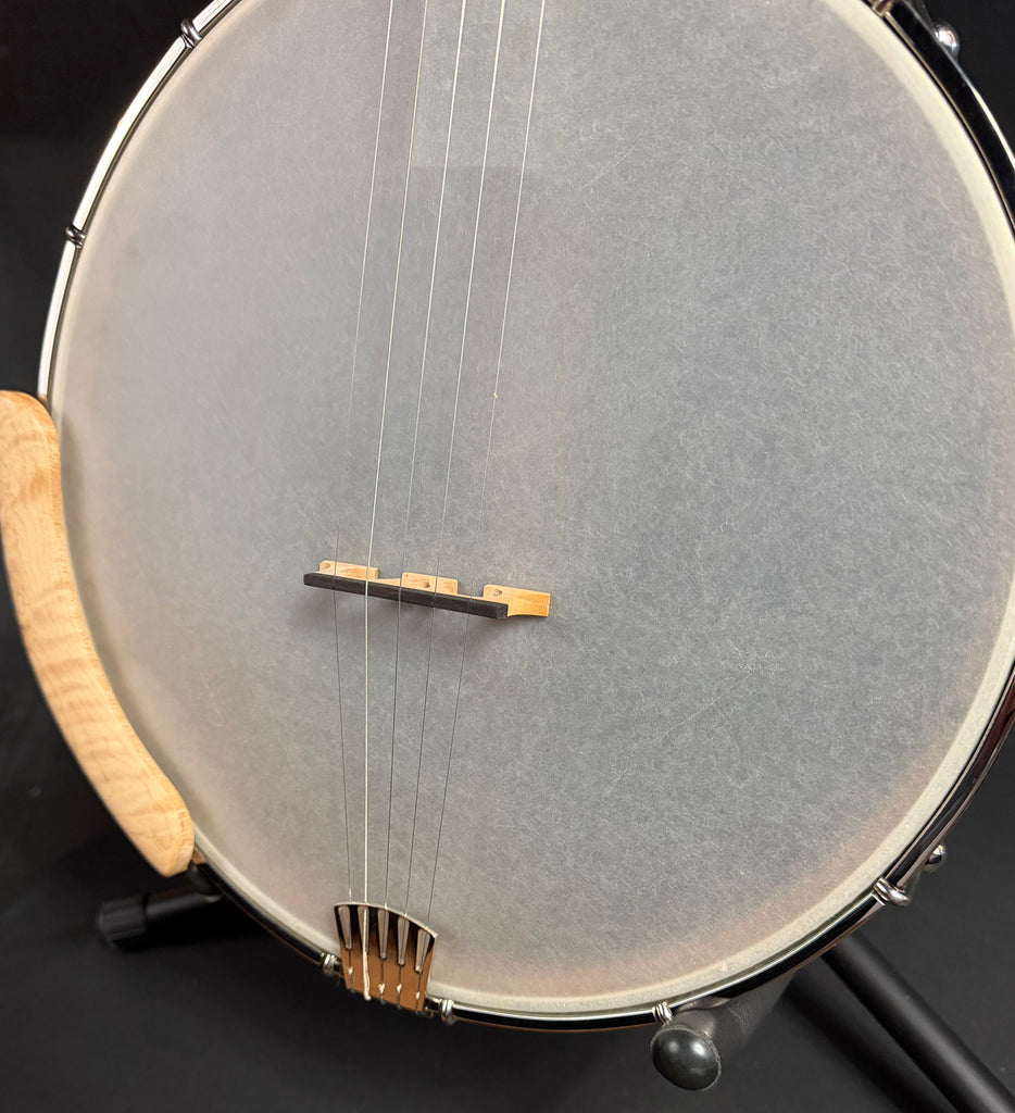 The full, woody tone of the High Moon rim is accented by a rolled flat brass tone ring. The twelve-inch Remo Renaissance head burnishes the sound, making it smooth but well-defined; each note is clear but mellow. Our patented Zero Glide string nut assures better intonation and open-string tone that matches the fretted-string tone. The light carry weight of just six and a half pounds eliminates “festival fatigue” and makes for a lively and richly resonant banjo.