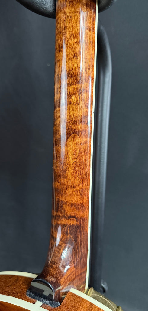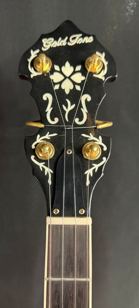 The newest addition to our series of tributes to the great banjos made before the Second World War continues with this, the most beautiful edition we’ve offered yet. The Gold Tone OB-Grandee (the Old West moniker for a Spanish nobleman) pays homage to one of the Holy Grail banjos of yore, resplendent in its engraved and gold-plated glory. We’ve responded to your many requests by offering this latest in the series that began with the OB-3 Twanger, followed by the OB-Béla and the OB-2 Bowtie. This professional-grade banjo hits all of the right notes (pun intended): the curly maple neck and resonator, premium hardware, bridge and tuning machines unite to bring you that pre-war essence without the wallet-busting price. And the TONE… the TONE!