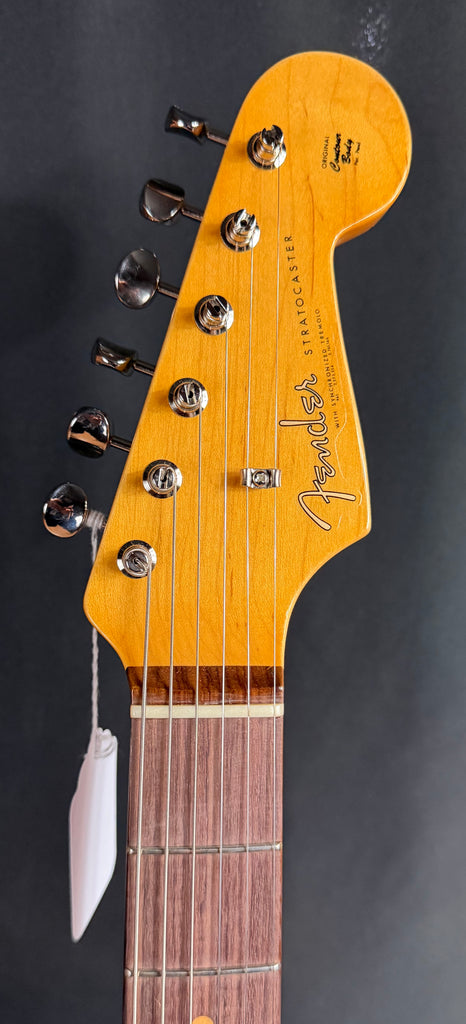 During the late ‘50s and early ‘60s, the popularity of Fender musical instruments flourished, and although the Fender assortment had expanded to include many great new instruments, the Stratocaster® reigned supreme. By 1961, the Stratocaster had taken on a more refined aesthetic, with a 3-Color Sunburst reformulated with a more vibrant red and bolder black edge, topped with a 3-ply pickguard accenting the Strat’s signature curves.