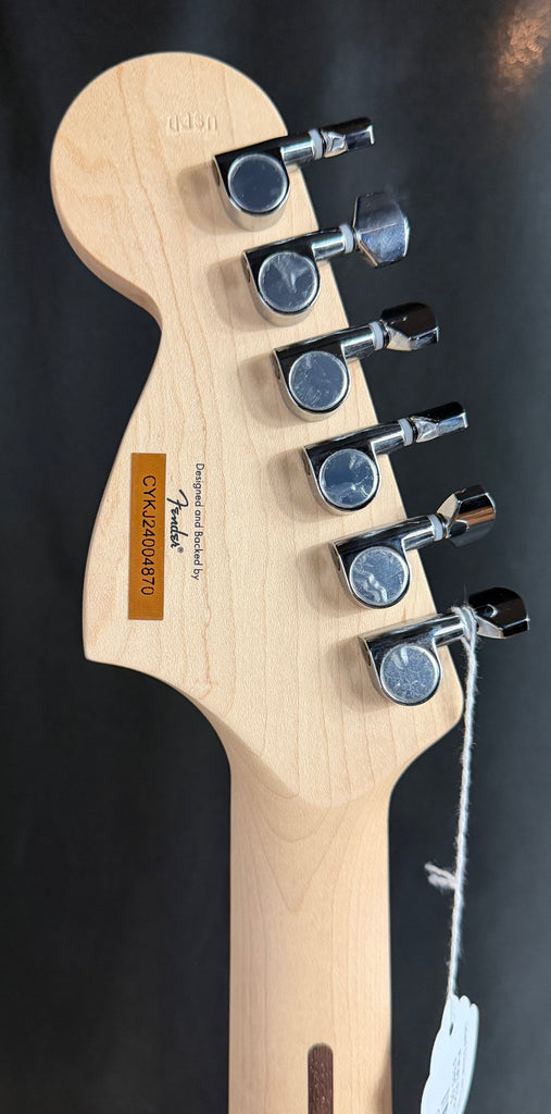 This 2024 Squier FSR Affinity Jaguar Electric Guitar is used with "used" stamped on the back of the headstock. It is in excellent condition although it does show a small ding on the back of the body (see picture). Otherwise, this guitar is very much in like-new condition and shows no dings, dents, scratches, or any obvious playwear. This guitar has been professionally set up and plays great! The neck is straight, the action is low and comfortable, and the frets are in excellent condition. Awesome deal on a fantastic playing and sounding Squier FSR Affinity Jaguar in a gorgeous Mystic Seafoam Finish!