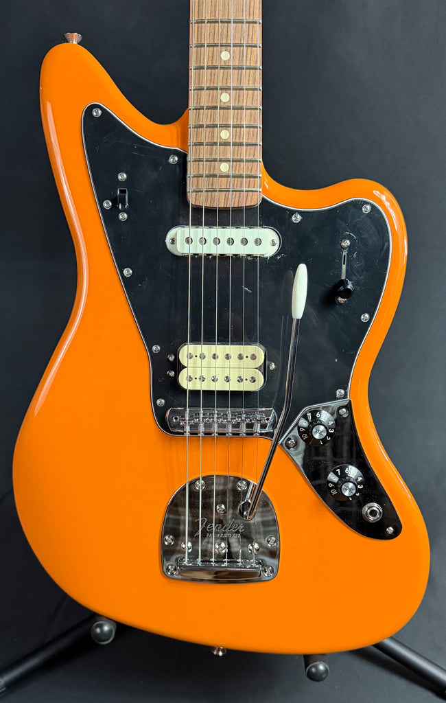 This 2021 Fender Player Series Jaguar Electric Guitar is used with "used" stamped on the back of the headstock. It is in excellent condition although it does show a small scratches on the back, bottom side of the body (see picture). Otherwise, this guitar is very clean and shows no dings, dents, scratches, or any obvious playwear. This guitar has been professionally set up and plays great! The neck is straight, the action is low and comfortable, and the frets are in excellent condition. Awesome deal on a great playing and sounding Fender Player Jaguar in a gorgeous Capri Orange Finish!