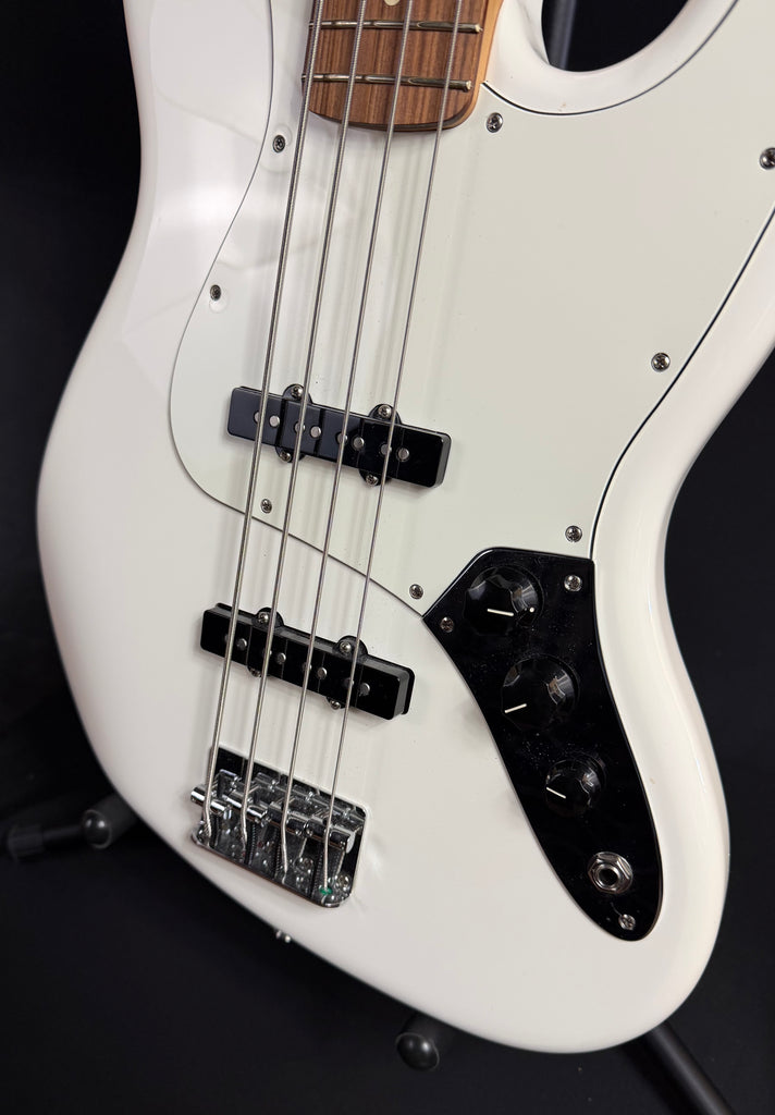 This 2021 Fender Player Series Jazz Bass 4-String Bass Guitar is used with "used" stamped on the back of the headstock. It is in mint condition and shows no dings, dents, scratches, or any obvious playwear. This bass has been professionally set up and plays great! The neck is straight, the action is low and comfortable, and the frets are in excellent condition. Awesome deal on a great playing and sounding Fender Player Jazz Bass in a gorgeous Polar White Finish!