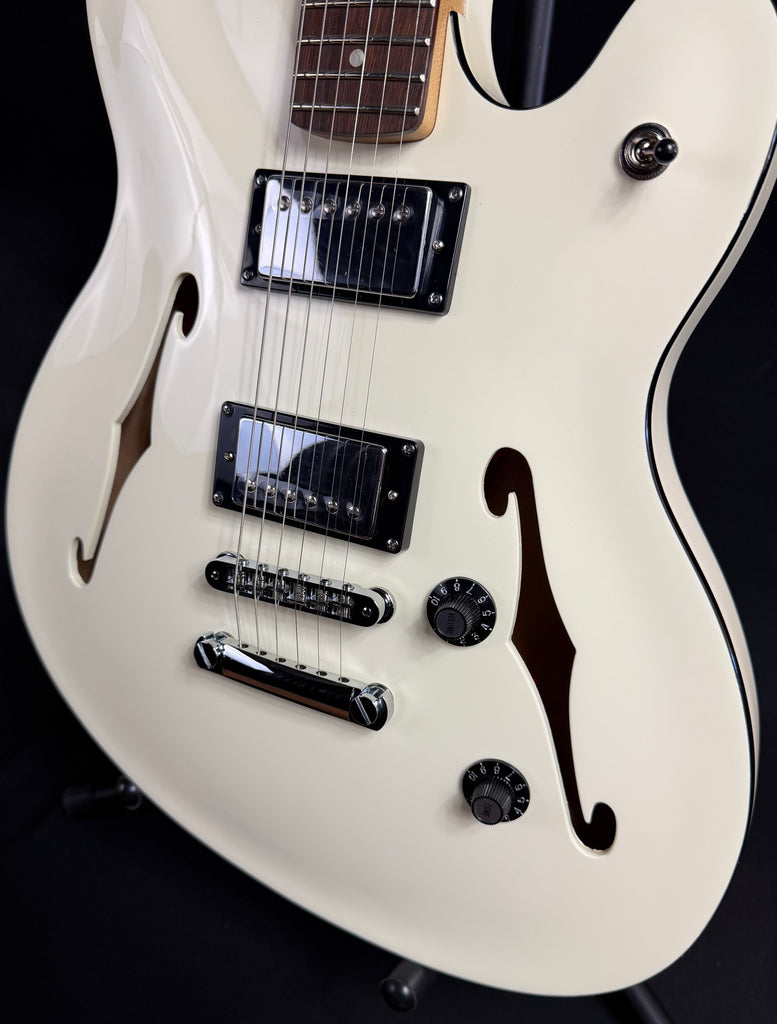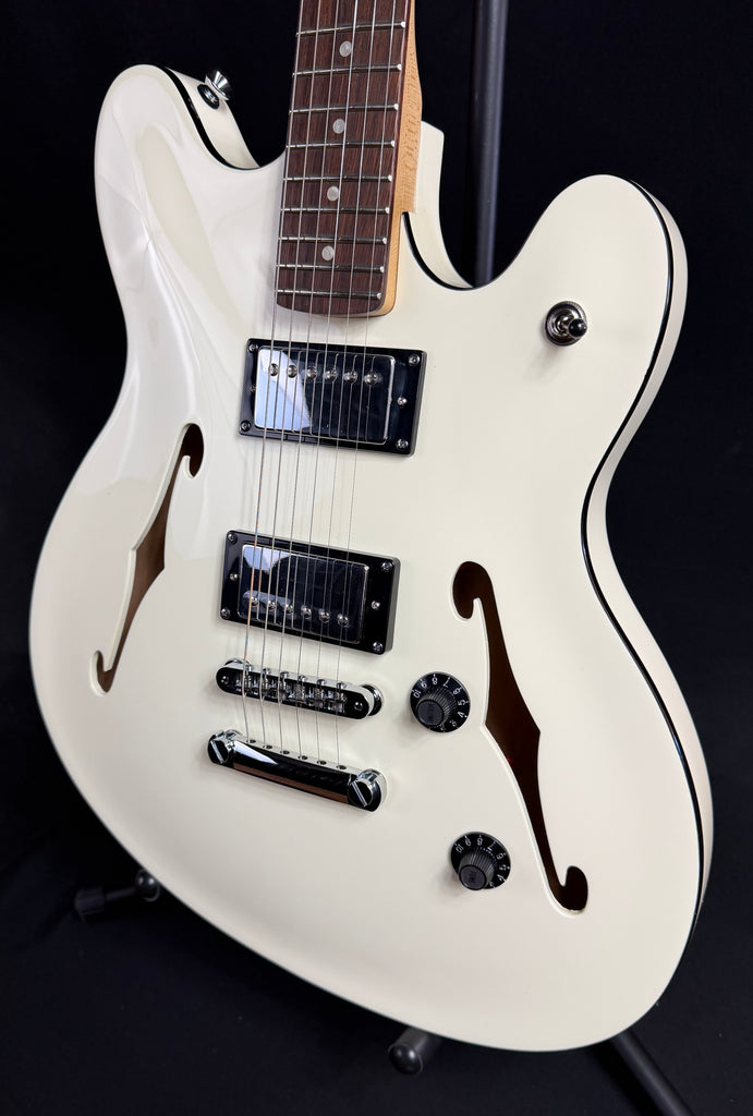 This 2024 Squier Affinity Starcaster Semi-Hollow Body Electric Guitar is used with "used" stamped on the back of the headstock. it is in mint condition and shows no dings, dents, scratches, or any obvious playwear. This guitar has been professionally set up and plays great! The neck is straight, the action is low and comfortable, and the frets are in excellent condition. Awesome deal on a fantastic playing and sounding Squier Affinity Starcaster in a gorgeous Olympic White finish!
